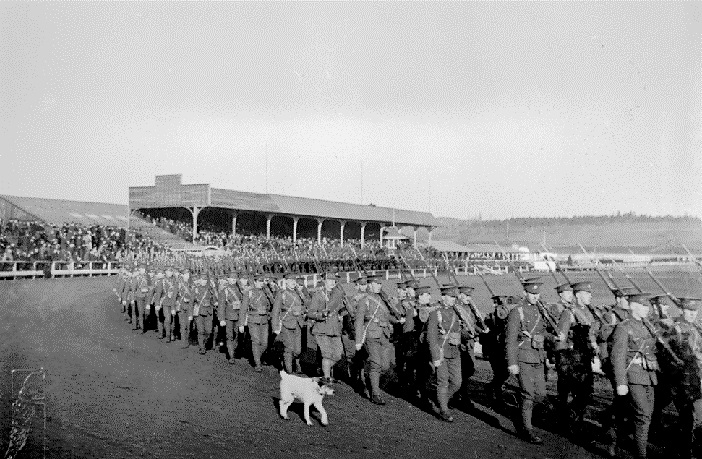 Most of the footage used in this clip shows troops at the Willows Army Camp, located at Willows Fairgrounds in Oak Bay. One exception is the introductory sequence, which shows a howitzer being loaded and fired, possibly at the Macauley Plains camp in Esquimalt. The other exceptions are scenes shot in downtown Victoria (at 2:17-2:32 in the clip) and downtown Vancouver (at 2:33-2:49). The latter, shot by pioneer filmmaker A.D. “Cowboy” Kean, shows the military honour guard at the 1916 UBC convocation ceremonies, marching past the Vancouver Court House (now the Vancouver Art Gallery).