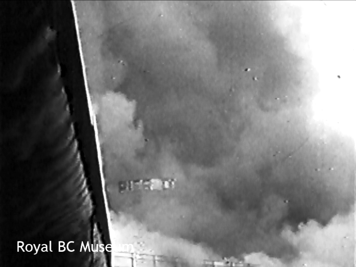 It’s interesting to compare the Burritt footage with another semi-amateur film of the same vintage, also held by the BC Archives. It’s Alfred E. Booth’s Kodachrome footage of the same fire [2], posted on YouTube by my Vancouver colleague Christine Hagemoen. (Thanks, Christine!)