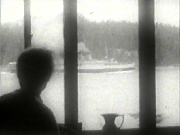 Although on first glance little more than a well-photographed holiday keepsake (with the requisite posing, repetition, and waving to the camera), Three There is actually a little Modernist essay in using film to create a sense of place and mood. The stillness of forest and fog, the motion of waves, and the passing of boats and steamships mark the languid rhythm of “island time.” The three friends amble down country roads and forest trails, take photos, hang out at the ocean’s edge, and chill in their rented cottage, “Skunk Manor.” Dorothy is featured in a series of striking vignettes, dancing and performing dramatic Martha Graham-like gestures in a suspended mirror. In one bravura unedited shot, 72 seconds long, the camera pans steadily to the right—from the outside wall of Skunk Manor, through the foliage to a nearby wharf, and out into the sea-shrouding fog (with a glimpse of Mayne Island across Active Pass)—before finally returning to land, with a shrub popping into the foreground. (This shot begins at 7:00 in the video file.)