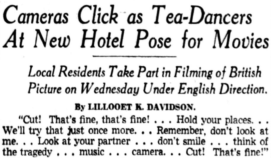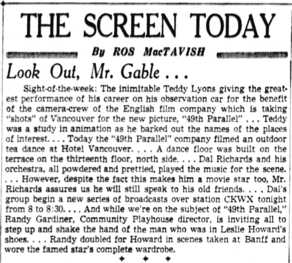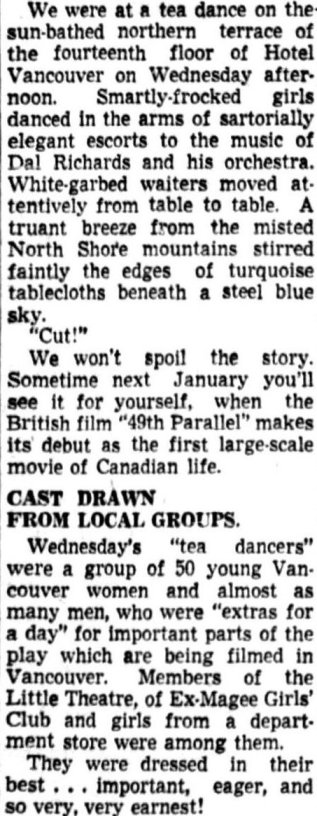 | No, that wasn’t a real tea-dance in progress on the roof of Hotel Vancouver Wednesday afternoon. There was no tea in the tea cups, “no petits fours” on the silver cake dishes, the ginger ale bottles were “empties.” It was all just “make-believe” for the filming of a sequence for “49th Parallel,” a dramatic story of spy rings in Canada with Leslie Howard and Elisabeth Bergner in leading roles. Sequences are being filmed all across the Dominion. Director John Seabourne and his camera crew manoeuvred 150 smartly-dressed young Vancouverites for hours in yesterday’s brilliant sun atop the hotel roof. Dal Richards and his orchestra were part of the scene and some of the movie “extras” were asked to dance while others sat at tables and talked. They are supposed to depict Vancouver’s reaction when news is broadcast that a Nazi submarine has torpedoed a Canadian tanker in the St. Lawrence, bringing the war to Canada’s shores. Similar scenes are being shot in all the principal cities across the Dominion. |