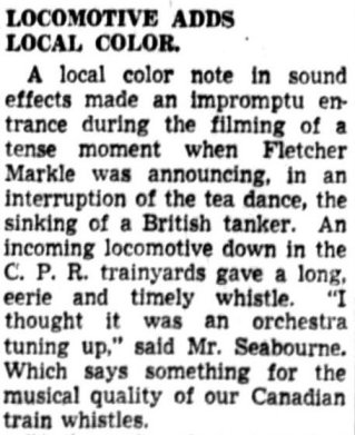 The Ortus Films crew was in Vancouver from July 30 to about August 10, 1940. The Vancouver sequences were filmed by associate director John (or Arthur) Seabourne3 and second-unit cameraman Osmond Borradaile.4 The footage shot comprised transitional scenes for use throughout the film. One key sequence was filmed on the 14th-floor outdoor terrace of the Hotel Vancouver, where a tea dance is interrupted by a radio news report about the sinking of the tanker. (Music for dancing is provided by Vancouver’s own Dal Richards Orchestra.)