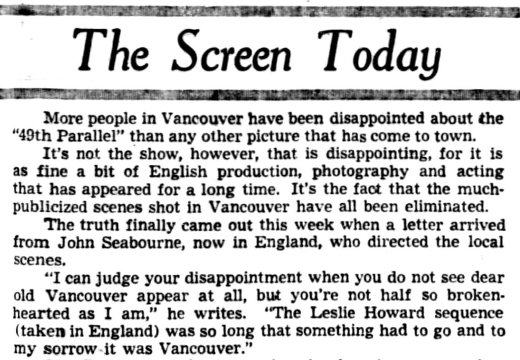 On 29 January 1942, 49th Parallel opened to enthusiastic audiences at Vancouver’s Vogue Theatre. Eighteen months after John Seabourne and the Ortus Films crew arrived in town, Vancouverites were finally able to see the stirring and patriotic film — in which their city did not appear.