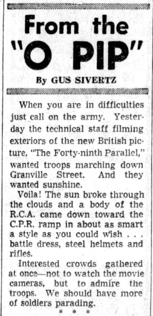 Other scenes shot nearby featured an open-topped streetcar (an BC Electric sightseeing car, with well-known conductor Teddy Lyons) and local troops marching down Granville Street.